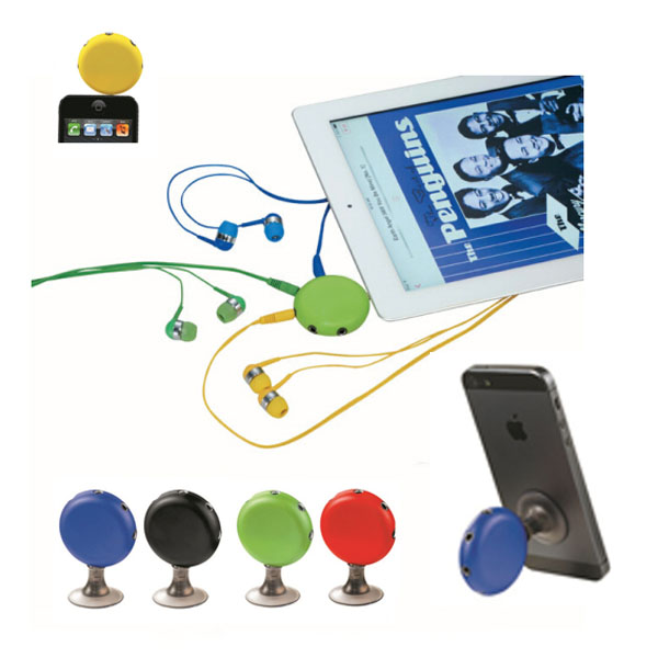Round ear bud splitter.This universal 3.5 mm music splitter allows up to five people to listen to the same media device at the same time! Press the suction cup against the back of your media device to create a stand. Made of ABS and comes in several fun colors to choose from. Your company name and logo imprinted on the surface for maximum brand exposure. Handy to have on desk, great for traveling. It's a perfect product for sales meetings, trade shows and more.