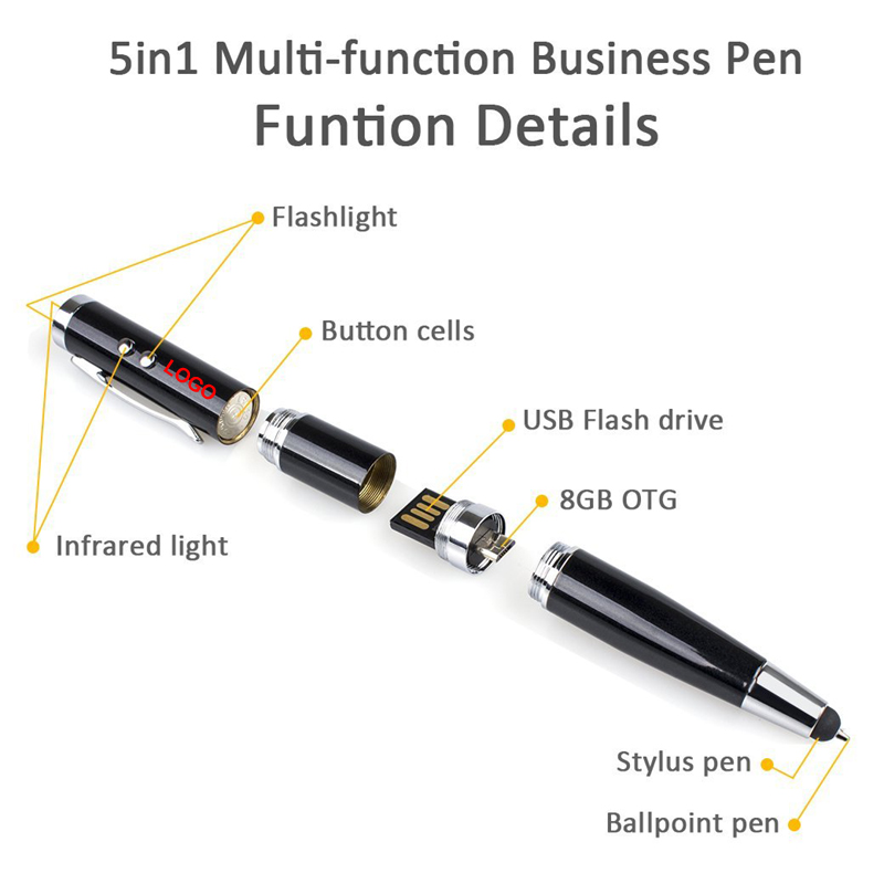 | Feature : | 5 in1 Multi-function Business Pen with 8GB USB OTG Flash Drive Stylus Pen & Ballpoint Pen & FlashLight |