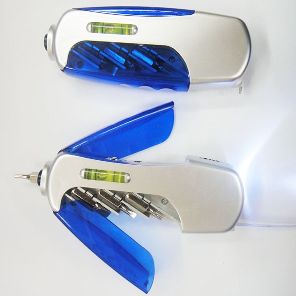 Promotional screwdriver set with LED flashlight is a compact multitool with 3 philips and 3 flathead driver bits, LED light, level and 1 meter tape measure. Three AG3 / LR41 batteries included.