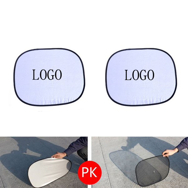 This highly reflective and insulated collapsible dual side window shade, made from silver coated nylon 190T material. Protect your passengers from extended exposure to the sun. Collapses for easy storage and mounts onto car window using 2 suction cups. Your company LOGO can be imprinted on the large area.