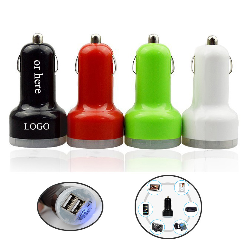 USB Car charger, with two USB sockets. It's a travel USB power adapter. One USB socket's output is 1 A, suit for your electronic device's regular charging. The other USB socket's output is 2.1A, faster charging for them. Both suit for cellphones,ipad,camera,GPS,PSP,MP3,MP4. Many colors and your customized LOGO is available.