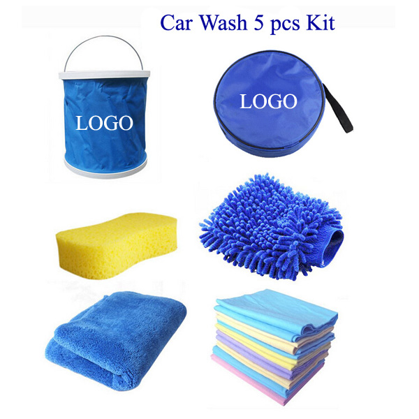 Portable car wash kit. Including 1 pc foldable waterproof bucket 11L, 1 pc microfiber towel, 1 pc fake chamios towel, 1 pc sponge brush, 1pc microfiber coral golve, and 1 pc packing nylon bag. Your customized LOGO can be imprinted on the outside of bucket or kit bag.