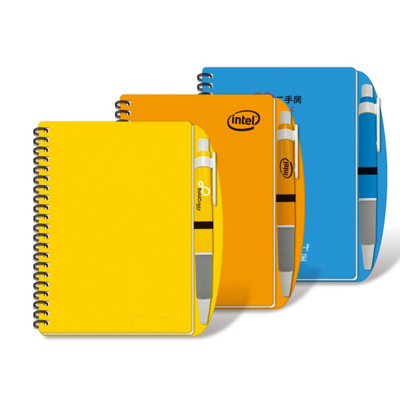 Quality notebook! Size 4.9"x5.7". The cover made of cardboard, including 100sheets and the pen. Many color options for you, and you logo can be imprinted on notebook and pen.