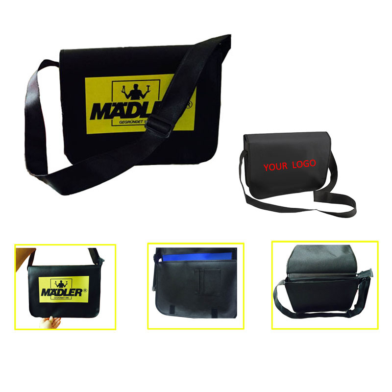 Messenger bag made from premium 120 GSM recycled non woven polypropylene. Features multiple pen slots, extra wide and adjustable shoulder strap and one large compartment with zipper, two Velcro (R) closure to keeps contents secure, this promotional bag is easy for most anyone to carry. Great for the gym, as an overnight bag or for toting around campus! Large imprint area welcome your logo.