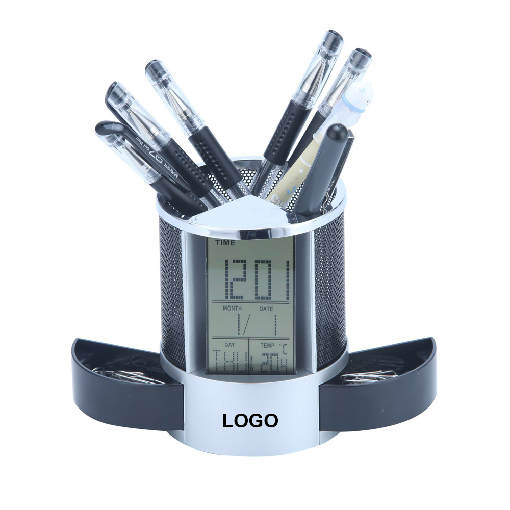 | Feature : | Portable Desk Pen Holder With Calendar, Temperature and LCD Alarm Clock. |