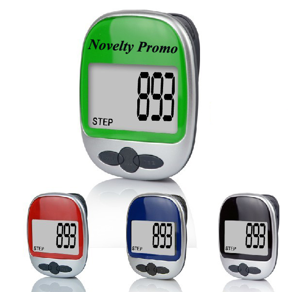 Digital Pedometer with clip. Features three buttons and large screen. Count the total number of steps per exercise activity. Help your promotion in Health Care Stores, Fitness Activities, Sports Event, and so on.