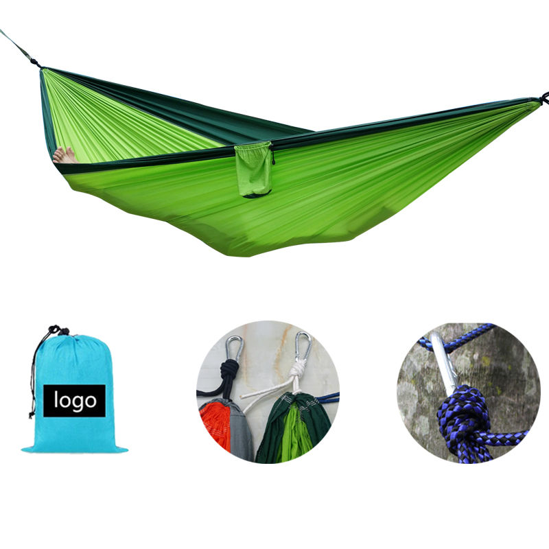 This set includes a double camping hammock, two tree friendly straps and two solid steel carabiners. Double hammock fits 2 persons, provide relaxing support up to 500 lbs. You will have everything you need for quick and easy hanging setup.A great gift for traveling, camping, backpacking, or just hanging it and relaxing on it in the patio. Many colors for your option. Your LOGO can be printed on the bags.