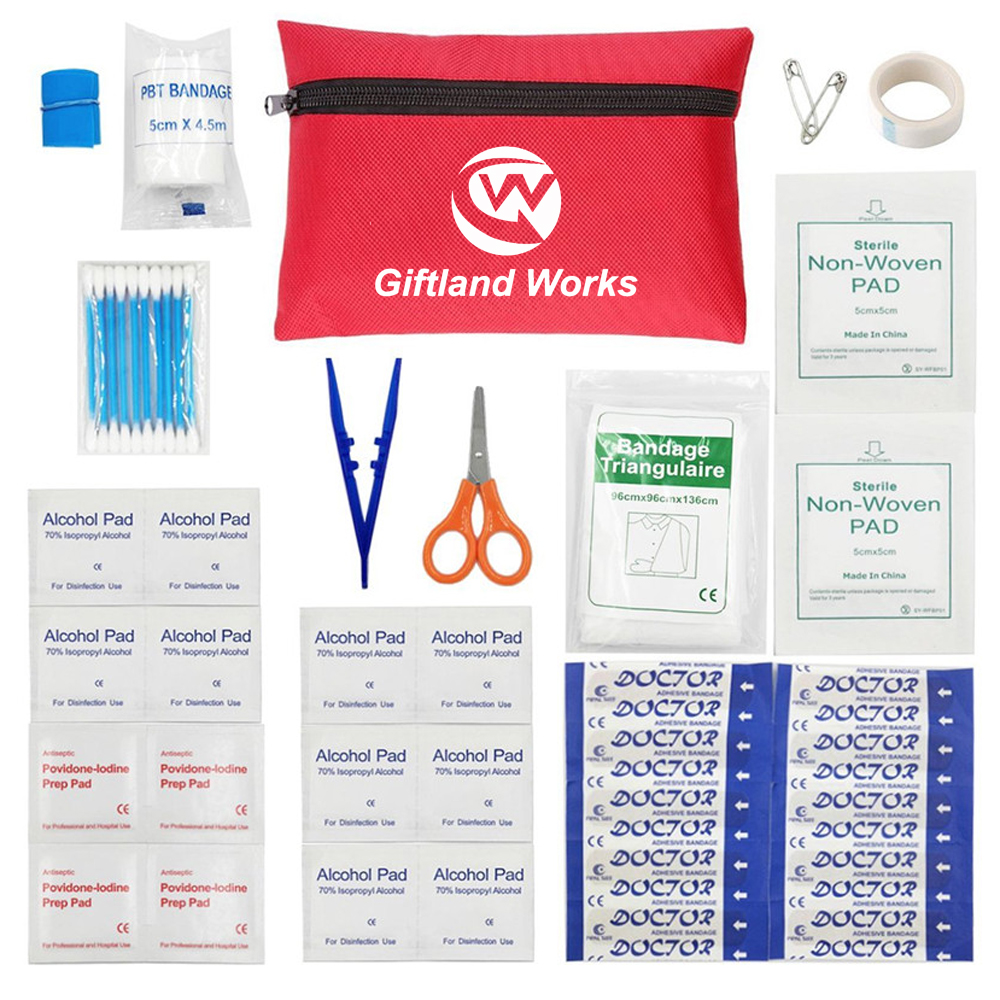 The kit contains 72 pcs valuable hospital grade medical supply which cover the majority usage in daily accidents. Include: safety pin, lodine prep pad, plastic tweezers, bandage triangulaire, scissors, PBT bandage, surgical tape, tourniquet, non-woven tape, alcohol pad, band-aid, storage bag and cotton swabs. It's made of high quality nylon. Durable soft bag with zipper that will not be broken easily. Which is water-proof, keeping the interior dry and safe. Your LOGO or artwork can be imprinted on it.