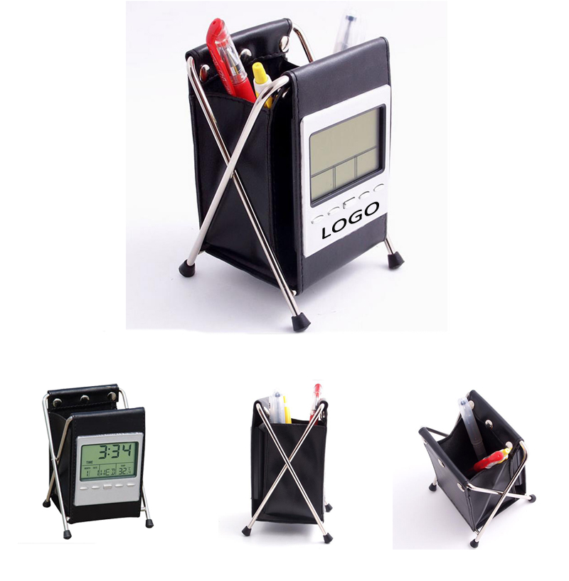 People can't wait to use this foldable pen container! Constructed out of black leatherette, suite for home or office. Includes calendar, timer, and temperature reading functions. it will makes an excellent gift or giveaway at trade shows and promotional events. Custom logo is acceptable. Great for promotion.