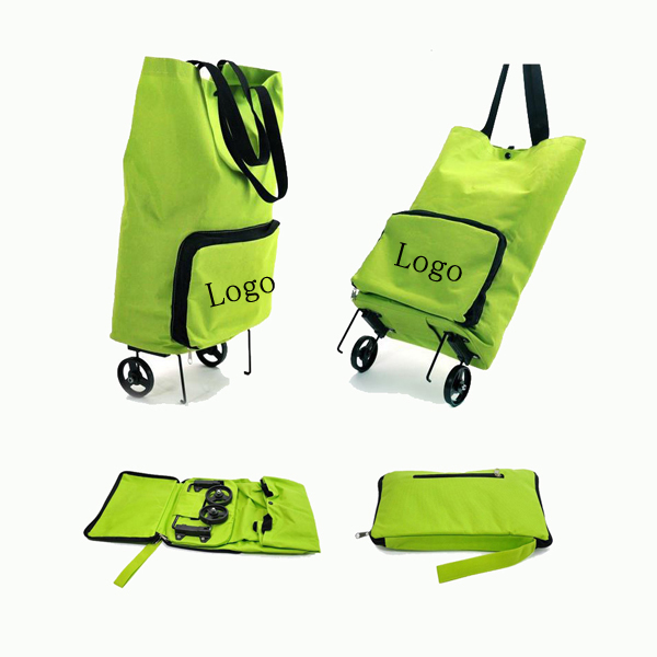 This folding shopping trolly bag is made of 600D Oxford fabric and internal fiberboard. It comes with stands, rolling wheels, tote and front/rear pouches. It folds with wheels and stands hide inside so that it features super save space. its size is11.8" x 6.3 " x 22.1 "and ideal for travelling, BBQ activities and more. Generous imprint area makes for great brand exposure.