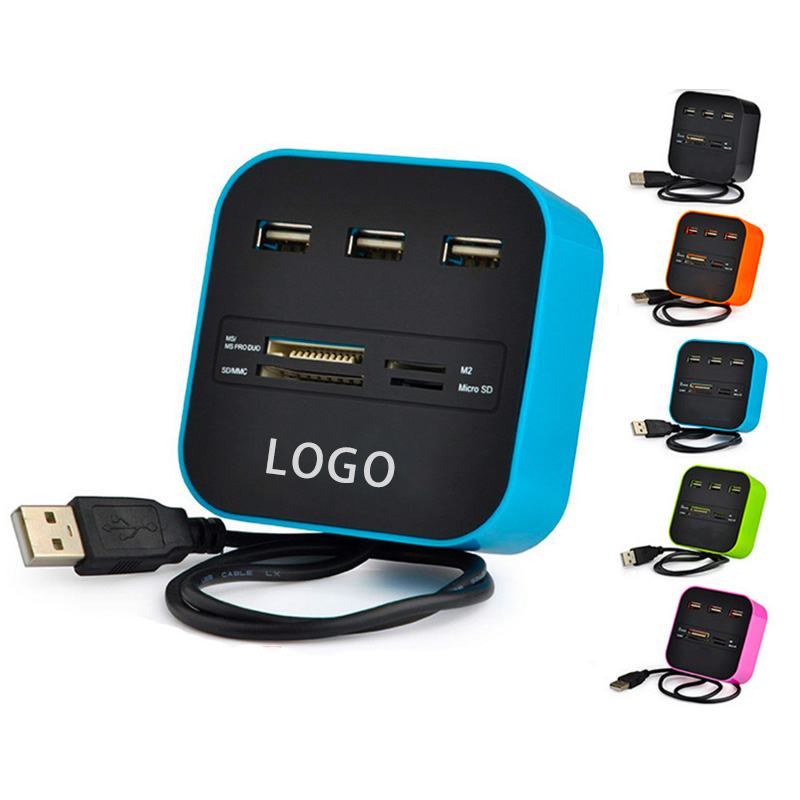 This Multifunction USB Hub with Card Reader Combo is the answer to all of your charging needs. It allows you to expand your productivity by connecting multiple devices to your computer all at once. This allows you to charge smart phones and tablets. No drivers, software or app required. Available in multiple colors to choose from, this USB hub can be customized via silkscreen imprinting to fit your brand's style. Your LOGO or artwork can be imprinted on it. It is suitable for all industry advertising promotions.