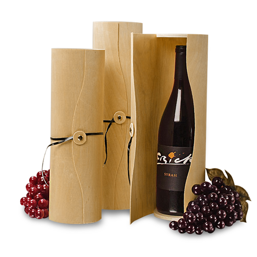This cylindrical wood wine box is made from thin unfinished poplar wood that is steamed and then bent under pressure to form these box shapes. Natural indentations may occur due to the manufacturing process. The bent wood is about as thin as cardboard. Each wine box is complete with a button string closure made with a poplar wood button and a thin leather stip. You can print or engrave your own logo on the box.