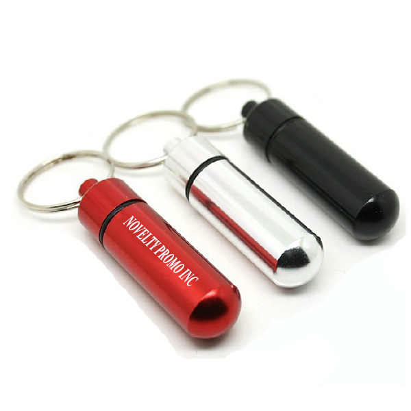 Metal Pillbox with Keychain, watertight, made from Aluminum Alloy. Size is 2"x1/2". Your best choice when you go out with pills. This pill box works very well in water parks, fishing trips, bike riding and camping. Your LOGO can be imprinted on or laser engraved.