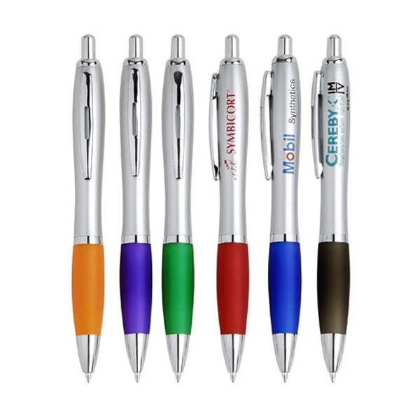 Click action plastic ballpoint pen. Colored grip and silver body, fashionable calabash shape. Black or blue ink for your option. Many grip colors and your customized LOGO is available.