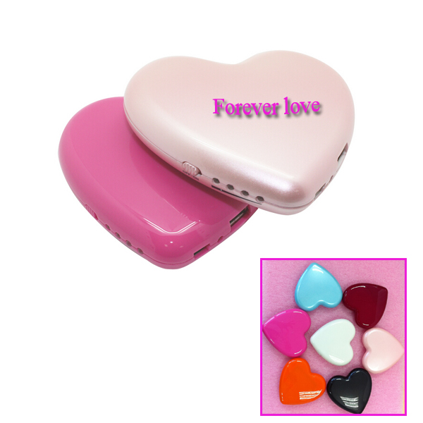 Heart shaped power charger or power bank, size is 4.1"x3.7"x1". Portable and heart shape design. The volume is 3500 mAh, made from high quality polymer battery. It's the suitable size to put it into your bags, ideal promotional item for ladies, wedding and Love theme activities. Can charge most of your portable electronic devices such as i Phone, i Pod, Samsung phones, Android smart phones, regular mobile phones, digital cameras, etc. Each full loading can charge your I phone 4 or 5 around twice.Recharge more than 500 times. Many colors and your customized LOGO is available.