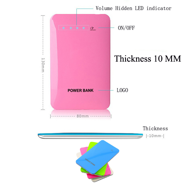High quality thin power charger or power bank with hidden LED indicator , size is 5.1"x3.1"x0.39". Super thin and stoving varnish surface design. The volume is 5500 mAh, made from high quality polymer battery. It's the suitable size to put it into your bags, ideal and popular promotional item. Can charge most of your portable electronic devices such as i Phone, i Pod, Samsung phones, Android smart phones, regular mobile phones, digital cameras, etc. Each full loading can charge your I phone 4 or 5 around three times. Recharge more than 500 times. Many colors and your customized LOGO is available.