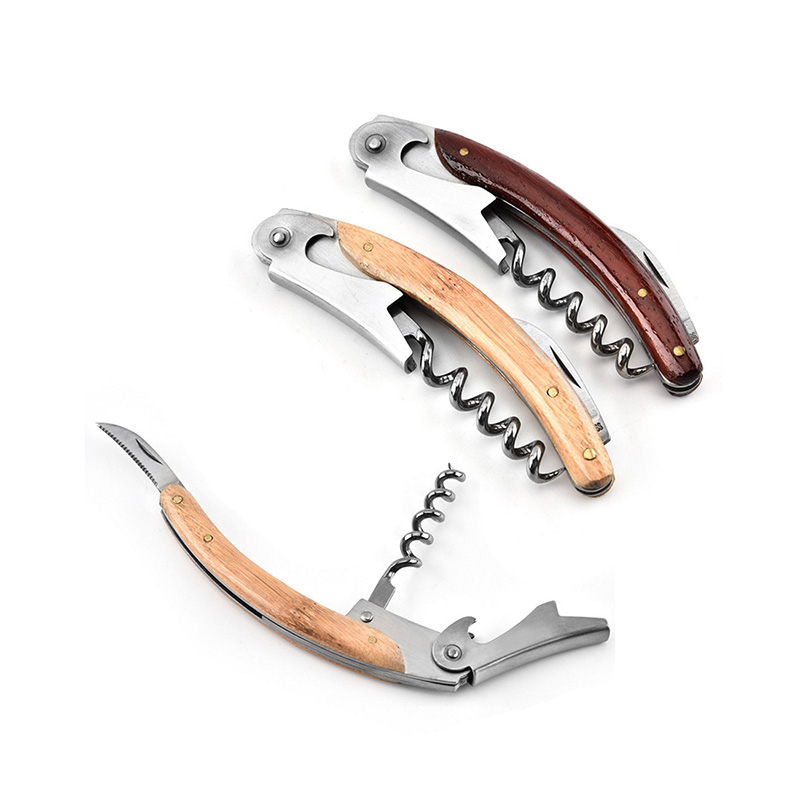 The bottle opener, made from high quality stainless steel and two wooden handle. Simple and easy to use, It can open a red wine bottle and a beer bottle. Your LOGO or artwork can be imprinted on it.