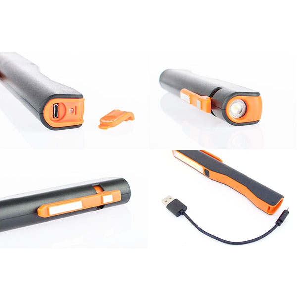 Brand new ABS body, white COB LED pocket light, inspection work light with a 180 degree rotating magnetic clip. LED at the head of work light provides a powerful white focus light which can be shoot longer distance. On/Off switch at the middle is easy to control: Push1-Top LED on. Push2-Side COB LED on. Push3-OFF. Powered by 2 rechargeable built-in lithium batteries. One Micro USB cable included. When charging, the red indicator light on, if full energy, green light on.