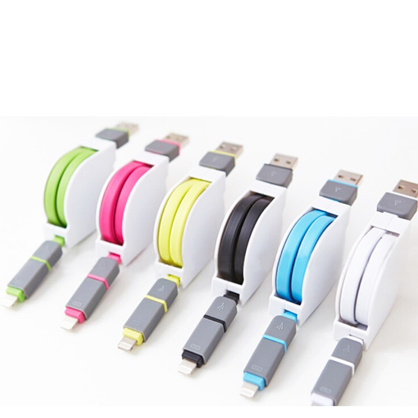 2 in 1 data sync cable compatible with iOS and Android for charging and data transfer. Flat and retractable cable design that prevents the cable from tangles and lasts longer. Maximum extendable length to one meter/3.2 feet.