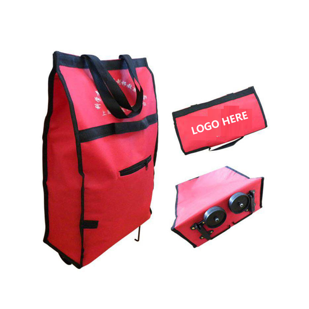This shopping cart is made of double layer 600D oxford. Stretching size is 30.7" x 12.6" x 6.3" and folding size is 13" x 7.5" x 1.96". Minimum order quanity is 100pcs to imprint logo. It's foldable, lightweight and easy storage and can be carried in the shoulder and dragged as well.