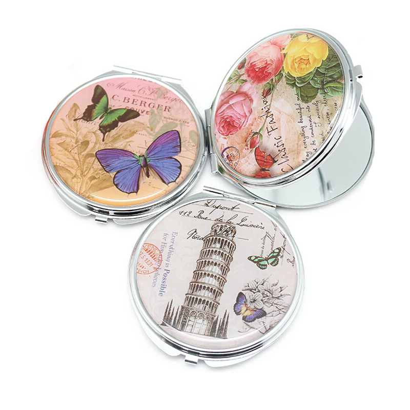 Custom high quality foldable cosmetic mirror. Round shape, double mirrors inside, easy opening. Pocket size: 2 3/8" X 2 3/8". Non-slip bottom design. Chrome plated metal surface. All material safety tested. Your artwork can be epoxy imprinted on the upside of lid. Hot sale on US market !