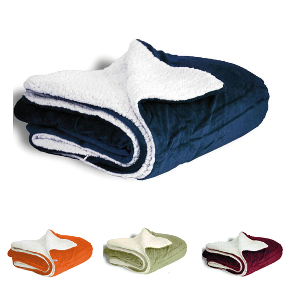 Sherpa blanket, one side is super soft short floss 190 gsm material, the reverse side is berber fleece 220 gsm material. Size is 50"x60". Each packed in one upscale vinyl bag with handle. Your LOGO can be embroideried.