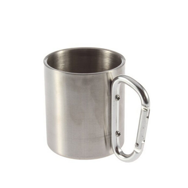 This stainless steel cup is great for outdoor use. Double layers cup, sturdy and durable. The surface is brilliance processing, the internal is matte brushed processing. Quick hanging handle, attach to backpack or belt, very convenient to carry and use.