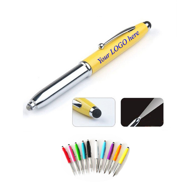 3 in 1 Stylus Ballpoint Pen. One side is capacitive stylus, suit for Iphone, Ipad and other capacitive touch screens. The other side is Led Flashlight with betteries inserted. Control the flashlight's on and off with pressing the LED bulb. Your LOGO can be laser engraved or silkscreen imprinted. Many colors for your option.