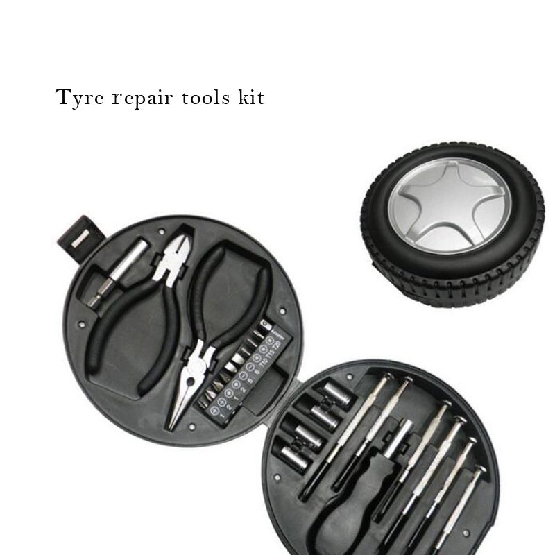 Our Tyre Shape Repair Toolbox has 6pcs screwdrivers with 10pcs different screwdriver bits, 4pcs sleeves with a sleeve handle and 2 pcs pliers, multi-function repair kit, enough for your daily life needs. You can keep in your car as well, in case of need. This is also a good gift that car dealership can give to their customers. Your Logo or artwork can be imprinted on it.