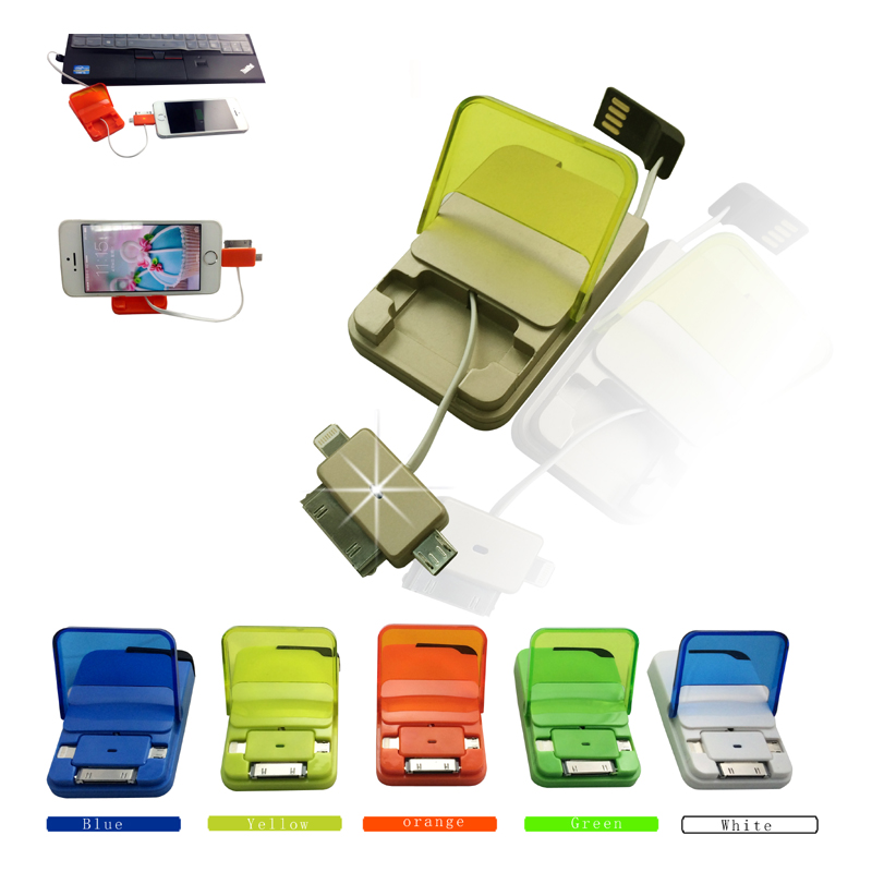 This novel and fashionable multi functional data cable box will attract your clients' attention deeply. It's not just a multi data cable, but also a phone holder, with LED light indicator. Adjust retractable cable length to charge power or transmit data, cable length max to one meter(39 inches). Including three interfaces: 8 Pin (for i phone 5), 30 Pin(for I phone 4 and I pad), Micro PIN (for tablet PC,GALAXY TAB,SAMSUNG phones,HTC phones and so on). Many colors for your option. Your customized LOGO can be imprinted on the outside of cable box.